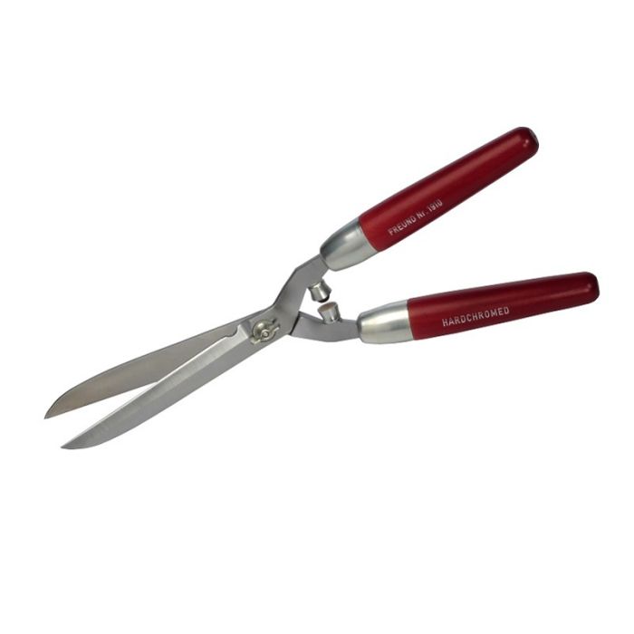 De heggenschaar Freund 1910 heeft rode houten grepen.